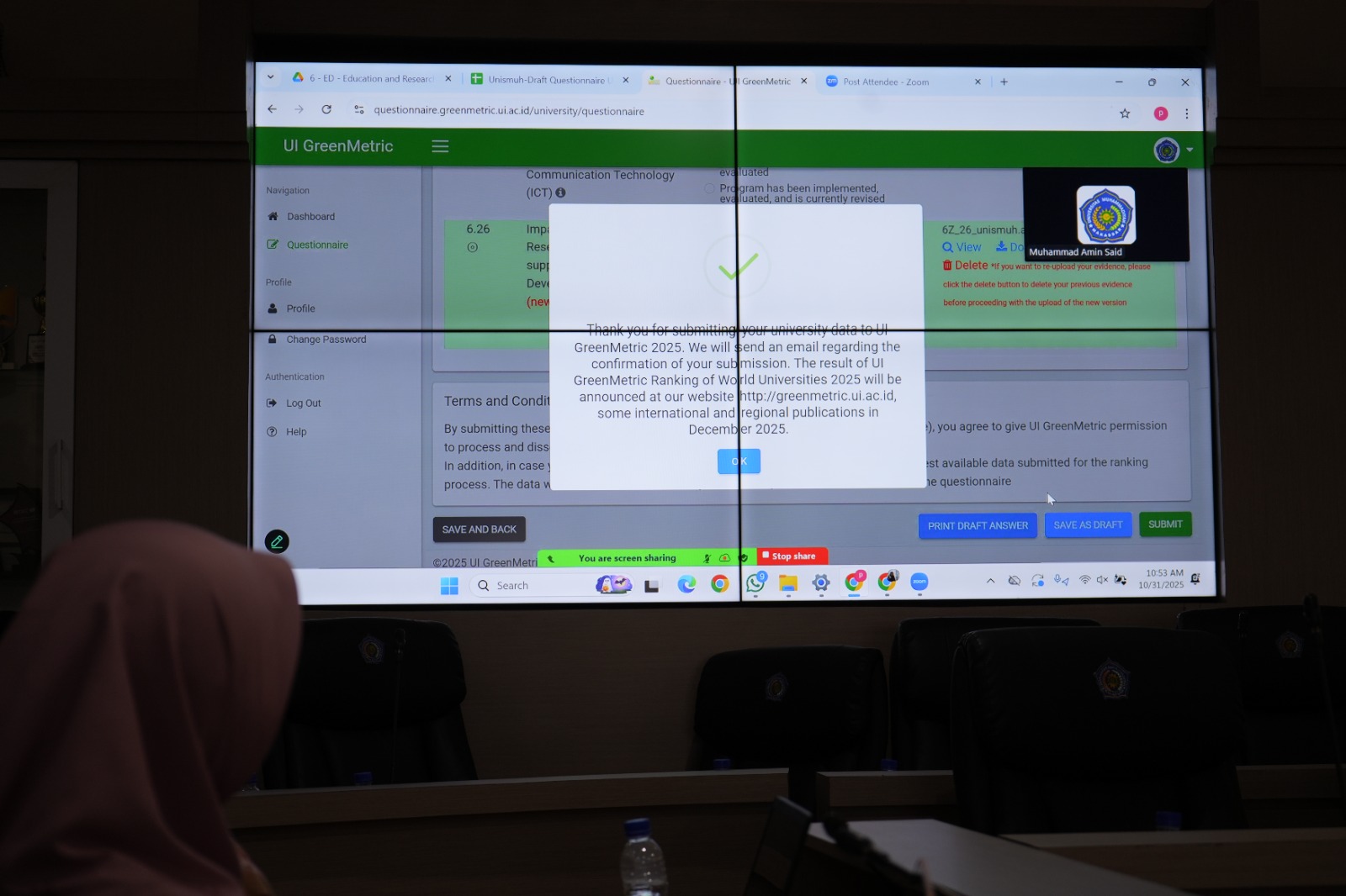 Porosmaju.com, Makassar — Universitas Muhammadiyah (Unismuh) Makassar resmi melakukan submit berkas pemeringkatan UI GreenMetric. Prosesi ini dilaksanakan di Ruang Rapat Senat, Gedung Iqra Lantai 17, Kampus Unismuh Makassar, Jumat, 31 Oktober 2025.