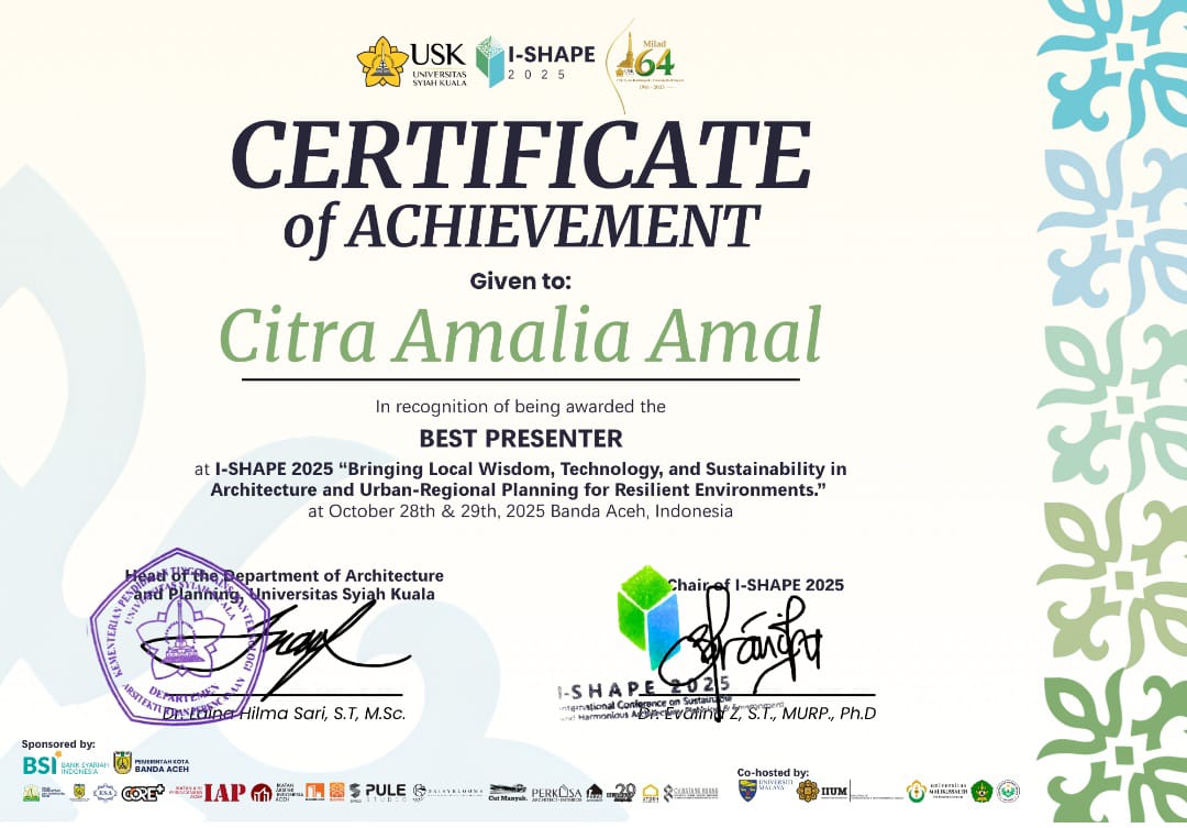 Porosmaju.com, Banda Aceh— Dosen Program Studi Arsitektur Universitas Muhammadiyah (Unismuh) Makassar, Ar. Hj. Citra Amalia Amal, S.T., M.T., IAI, meraih penghargaan Best Presenter dalam konferensi internasional I-SHAPE 2025 (International Conference on Sustainable and Harmonious Architecture, Planning & Environment) yang digelar di Banda Aceh, 28–29 Oktober 2025.