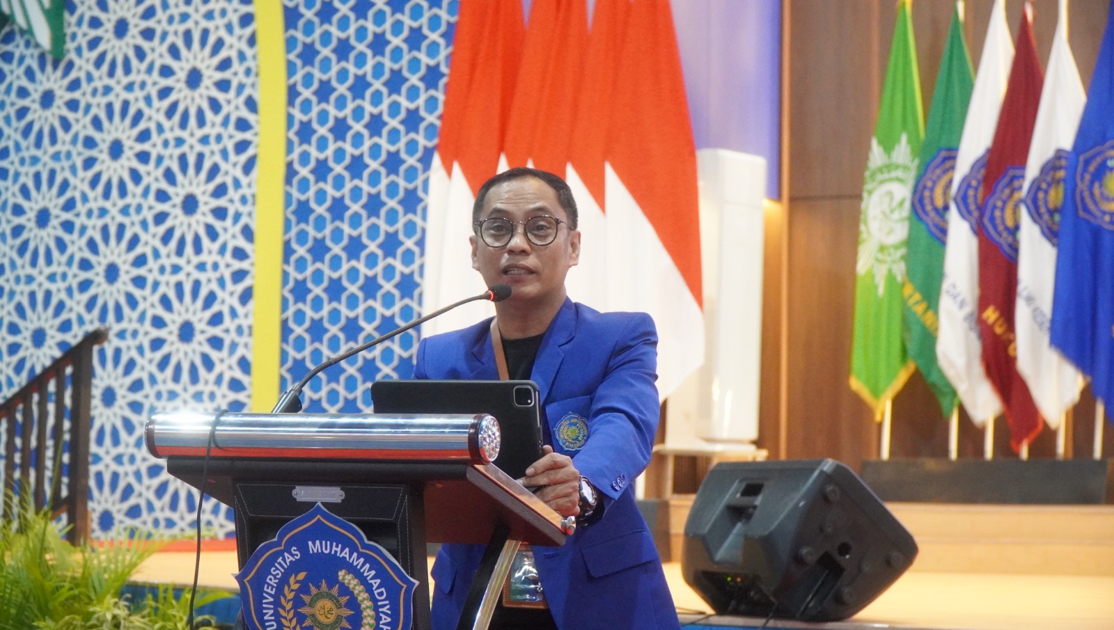 Ketika Prof. Andi Sukri Samsuri, Wakil Rektor I Unismuh, mengambil alih podium, suasana berubah. Jika Akhir adalah sosok yang memompa energi, Prof Andis, sapaan akrab Warek I Unismuh itu, hadir sebagai guru besar yang menancapkan fondasi. Nada suaranya lebih tenang, langkahnya mantap, dan kacamata minusnya memantulkan cahaya layar besar di belakangnya—layar yang sesekali menampilkan logo Unismuh berdampingan dengan peringkat perguruan tinggi dunia.