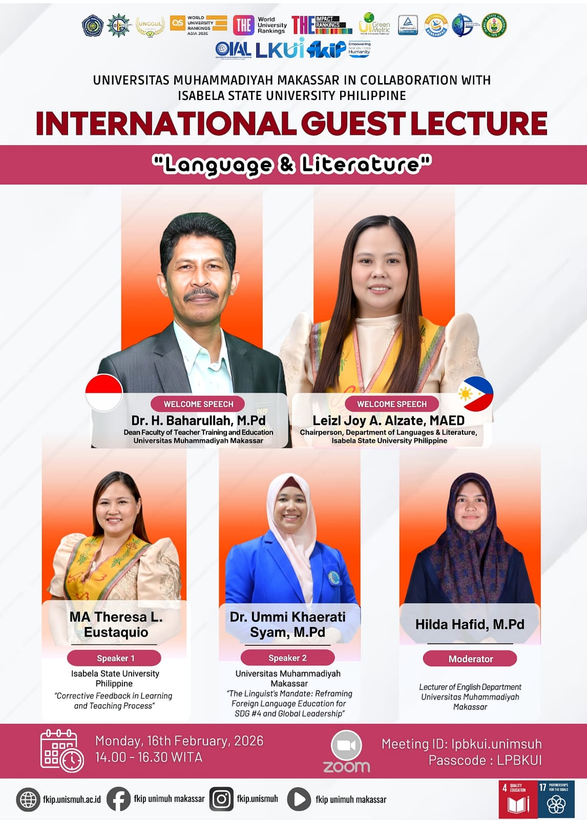 Porosmaju.com, Makassar — Komitmen memperkuat internasionalisasi pendidikan tinggi terus ditunjukkan Universitas Muhammadiyah Makassar melalui penyelenggaraan International Guest Lecture bertema Language & Literature bersama Isabela State University. Senin, 16 Februari 2026. Kegiatan yang digelar secara daring melalui Zoom ini diikuti dosen dan mahasiswa lintas program studi.