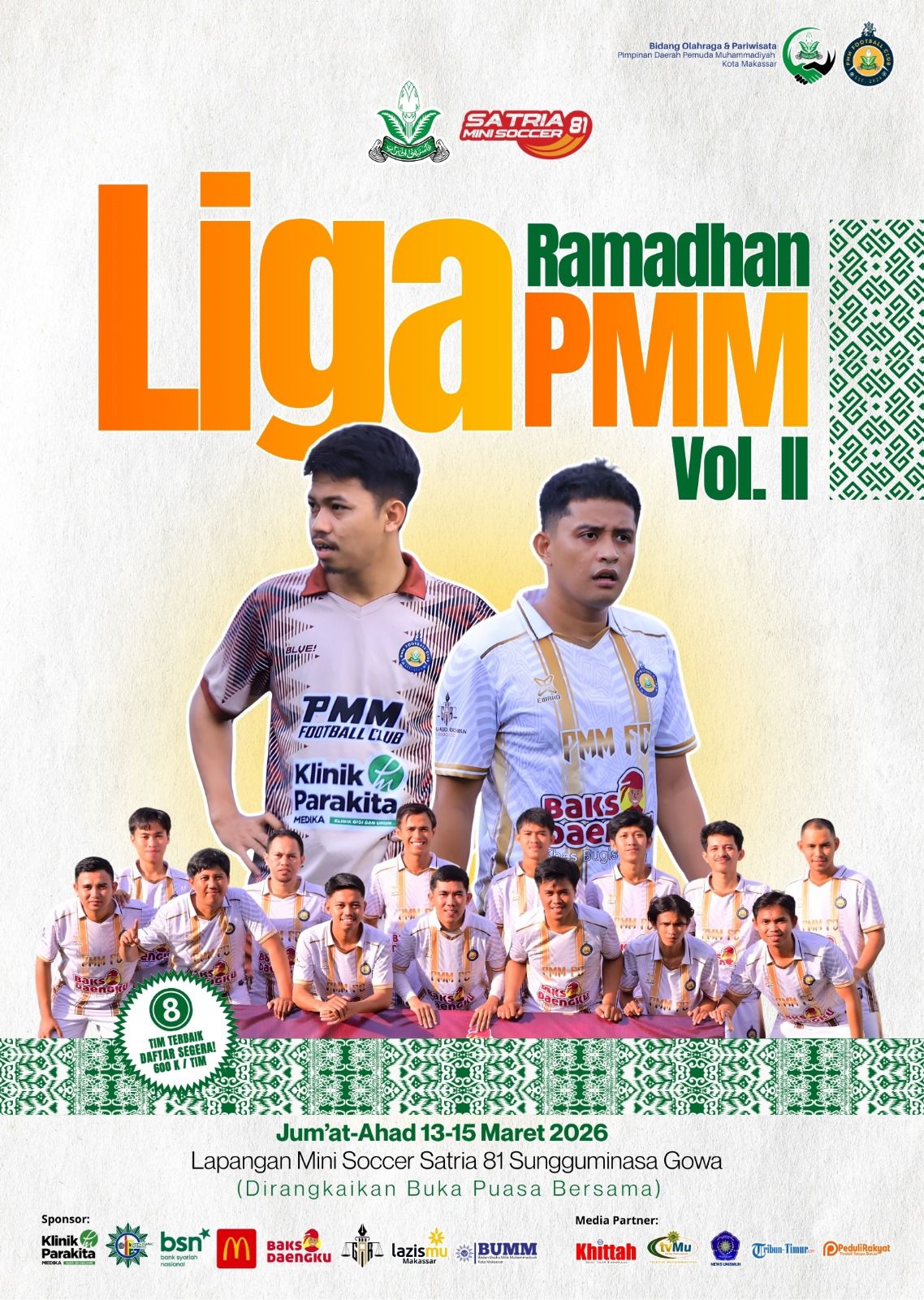 Porosmaju.com, Makassar — Di tengah riuh kompetisi sepakbola nasional dan komersialisasi olahraga yang kian menguat, Pemuda Muhammadiyah Makassar memilih menjadikan mini soccer sebagai ruang pembinaan karakter dan dakwah kultural. Melalui Liga Ramadan Vol. II, yang akan digelar pada 13–15 Maret 2026 di Lapangan Satria Mini Soccer 81, Sungguminasa, Gowa, organisasi kepemudaan ini menegaskan bahwa olahraga bukan sekadar pertandingan, melainkan juga perjumpaan nilai.