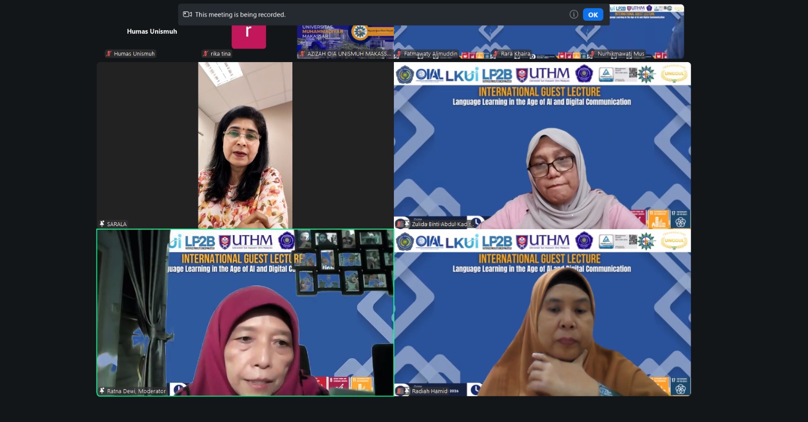 Porosmaju.com, Makassar– Universitas Muhammadiyah Makassar (Unismuh Makassar) bersama Universiti Tun Hussein Onn Malaysia (UTHM) menggelar kuliah tamu internasional bertema Pembelajaran Bahasa di Era Kecerdasan Buatan dan Komunikasi Digital, Selasa 3 Maret 2026. Kegiatan yang dilaksanakan secara daring melalui Zoom itu membahas dampak kecerdasan buatan (AI) terhadap proses pembelajaran, komunikasi, dan praktik penulisan akademik di perguruan tinggi.