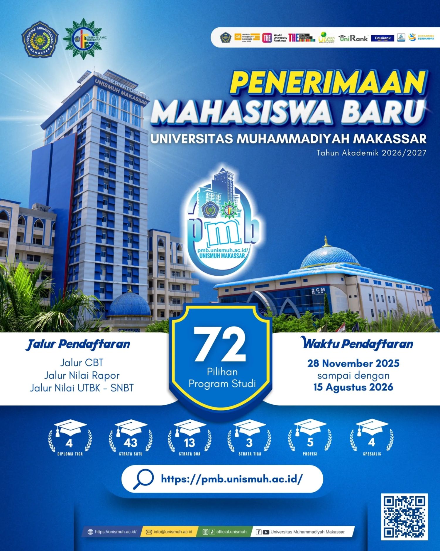 Selain itu, Unismuh juga masuk Times Higher Education Impact Rankings 2025 di posisi 1001–1500 dunia, serta tercatat dalam radar Times Higher Education World University Rankings 2026. Keren, kan?