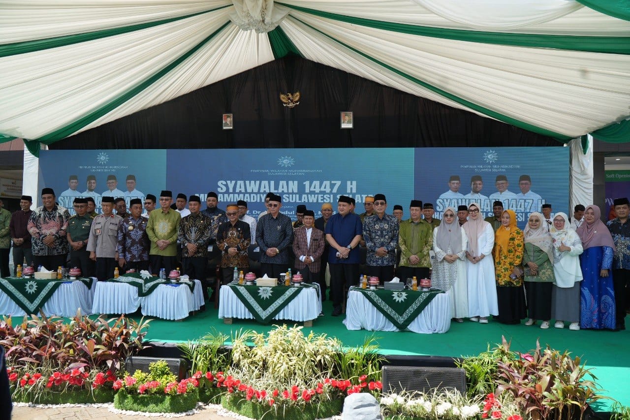 Porosmaju.com, Makassar — Syawalan 1447 Hijriah Pimpinan Wilayah Muhammadiyah Sulawesi Selatan di Halaman Pusat Dakwah Muhammadiyah Sulsel, Sabtu, 28 Maret 2026, berlangsung dalam suasana ramai dan khidmat. Forum itu dihadiri tokoh nasional, pimpinan persyarikatan, kepala daerah, pimpinan amal usaha, serta warga Muhammadiyah dari berbagai daerah di Sulawesi Selatan. Dari panggung acara, Syawalan tampak bukan hanya menjadi ajang halalbihalal, tetapi juga pertemuan besar yang memperlihatkan luasnya jejaring sosial Muhammadiyah di Sulawesi Selatan.